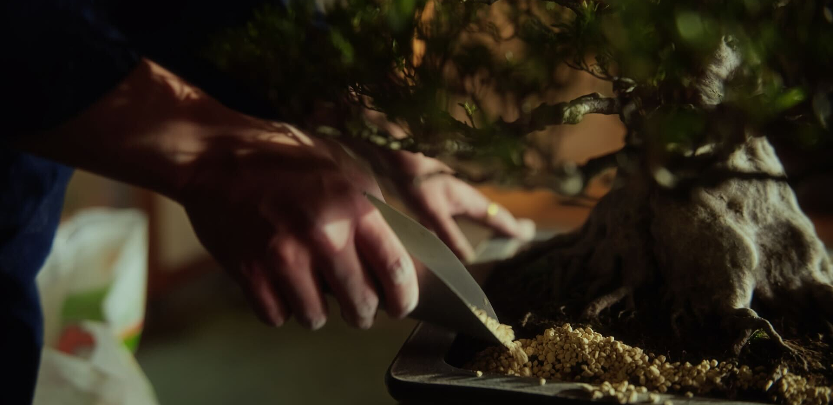 盆栽家 眞利子 大輔は、その痕跡を「どの角度から見れば最も美しく見えるか」を判断し、樹形の見極めと構成、剪定と整枝の再構築、根の処理と苔・土の演出を再設計します。